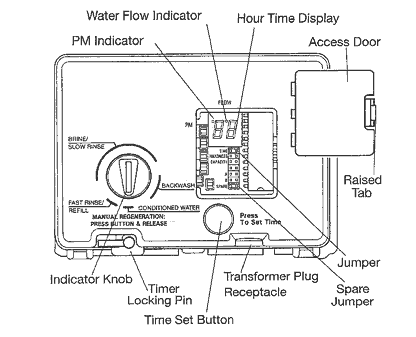 Open the access door by pushing the raised tab on the door toward the left while pulling the tab out. With the jumper on the set of pins next to the word TIME, set the time of day to the closest hour by pressing the black TIME SET button. PM hours are indicated by a light next to the letters PM on the display window