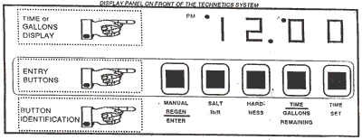 - When correct time is displayed, press button on far left, above “MANUAL REGEN/ENTER”